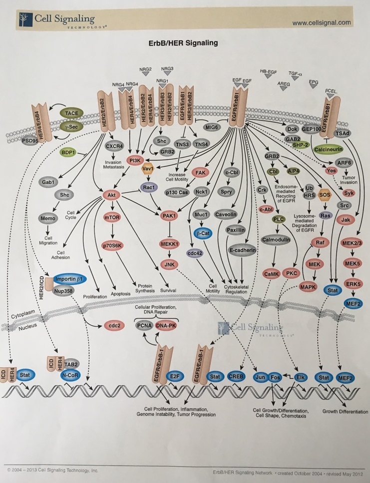 細胞膜を貫通して存在する糖タンパクで、HER1,ErbB1とも呼ばれる。★ Signalingイメージを見せてもらった。